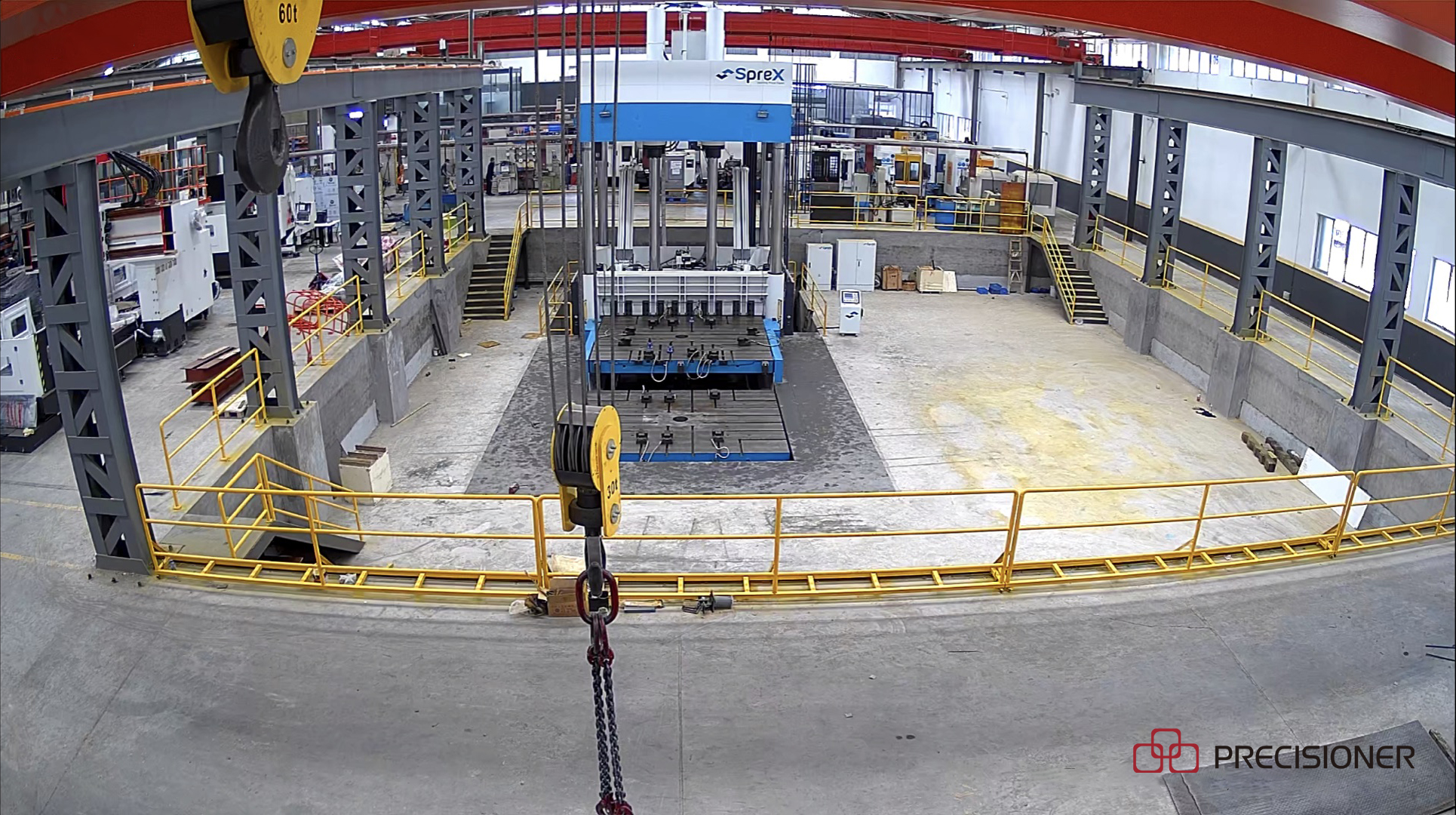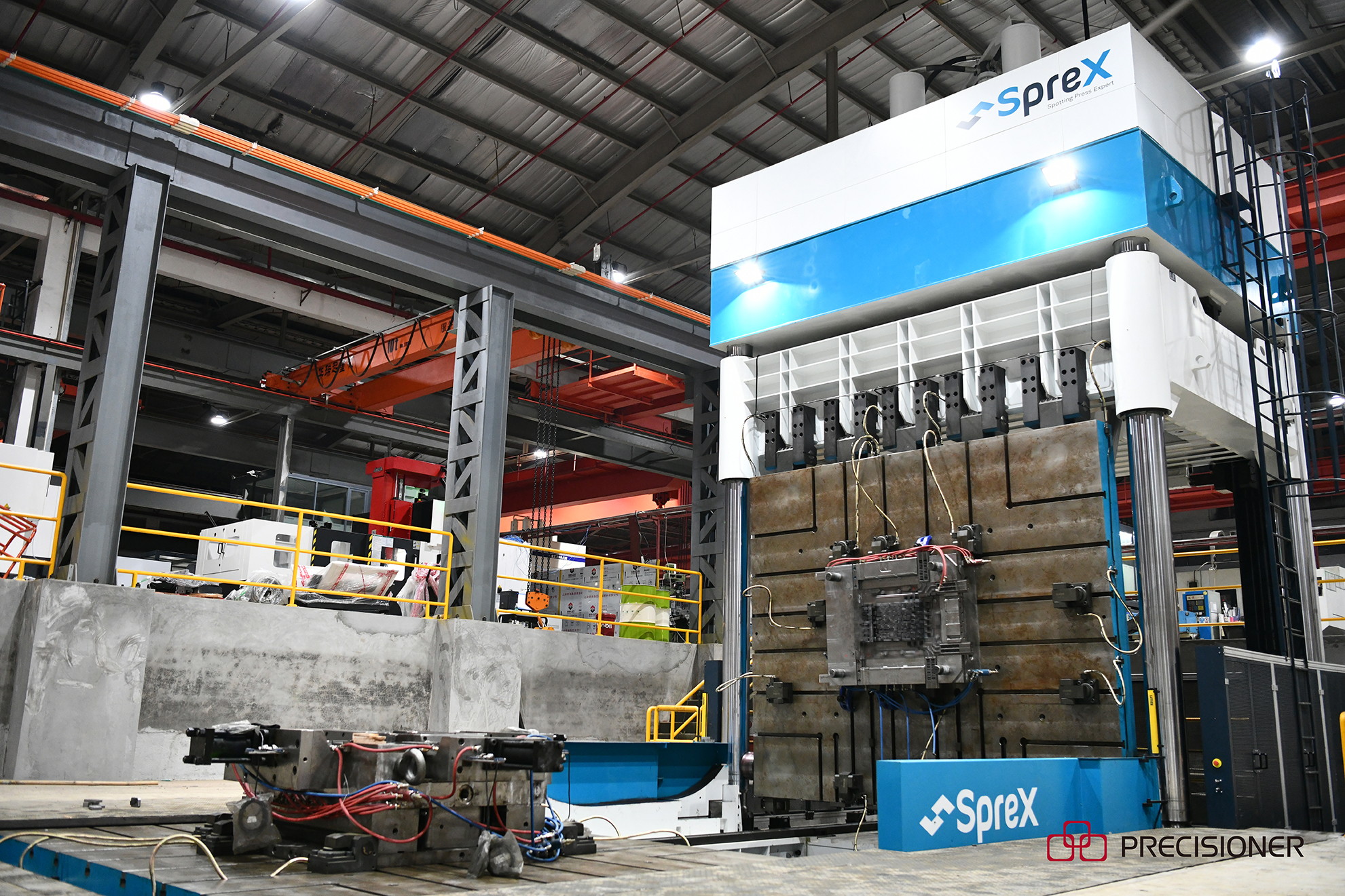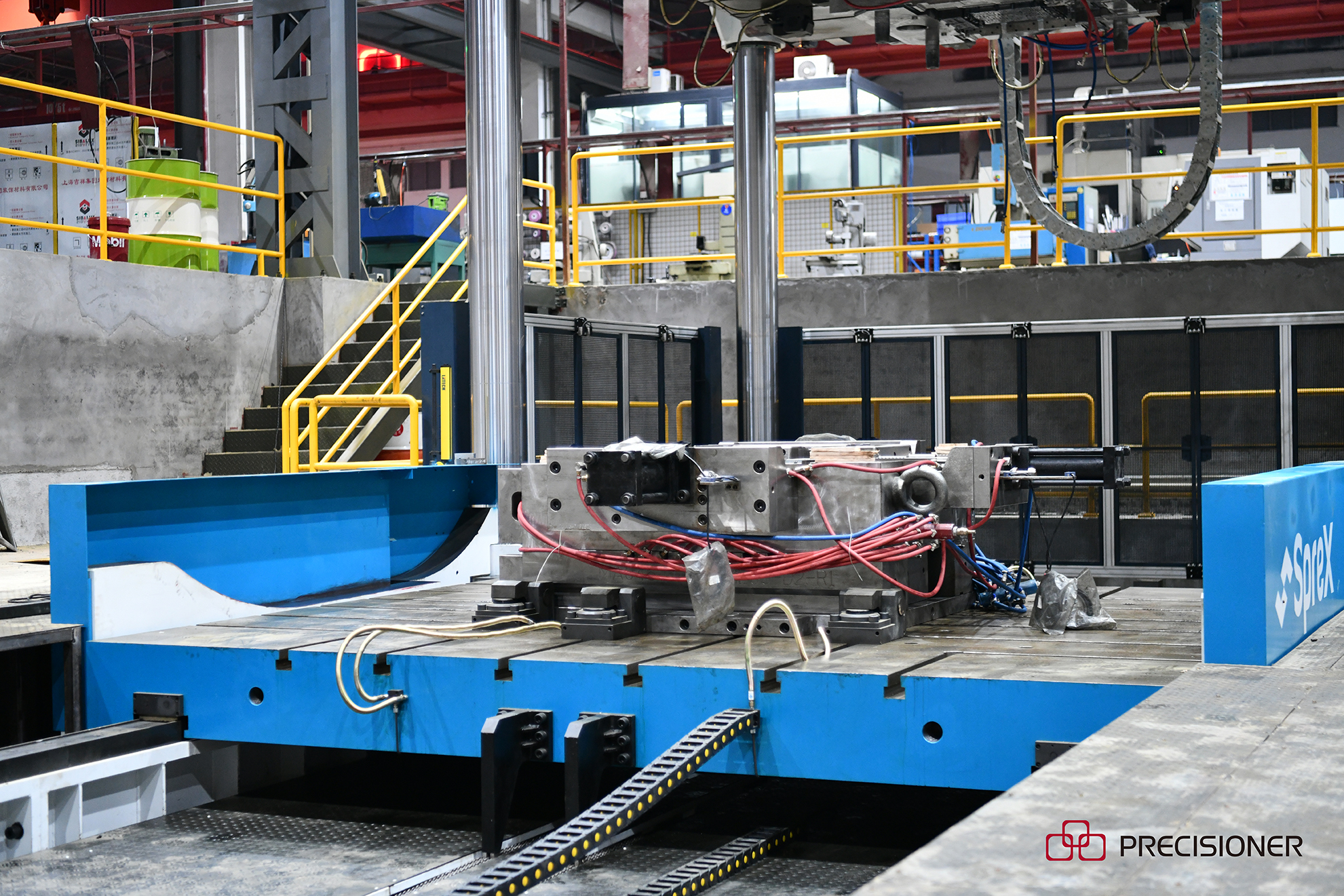 800T大型合模機可容模尺寸為4.2×3.5M,合模重量190T,翻轉能力105T,可以配4000-8000T的模具。該臺合模機體量較大,機身11.9米約三層樓高,占地約100平方米,現場觀摩大型合模機工作畫面相當壯觀。