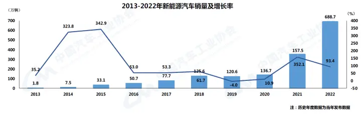 中國汽車工業(yè)協(xié)會最新統(tǒng)計顯示,2022年我國新能源汽車持續(xù)爆發(fā)式增長,產(chǎn)銷分別完成705.8萬輛和688.7萬輛,同比分別增長96.9%和93.4%,連續(xù)8年保持全球第一。