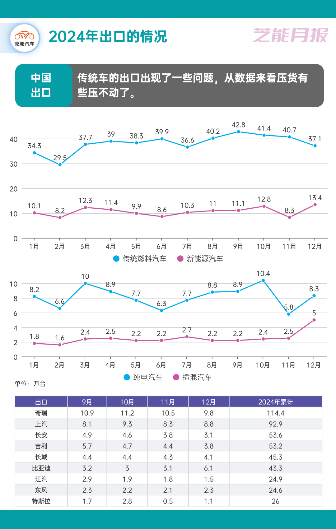 ◎ 而純電動(dòng)汽車出口 98.7 萬(wàn)輛,同比下降 10.4%。