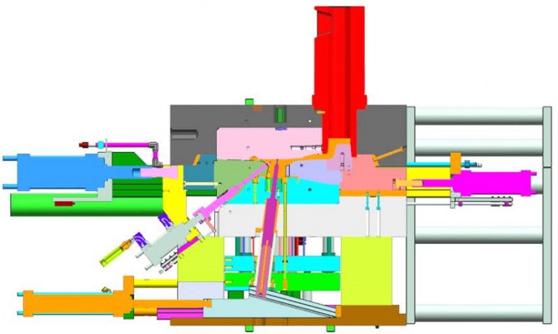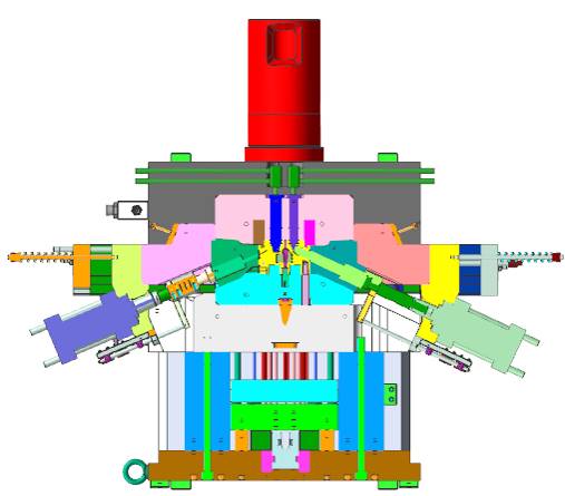 動模部分的行位內有較斜度孔位成型,這樣的大角度使得如何設計固定行位使行位鑲針不退位,使行位穩(wěn)定運行尤為重要,如圖所示,此項目我們采用液壓+機械行位,依靠機械力固定行位結構,經(jīng)測試驗證,