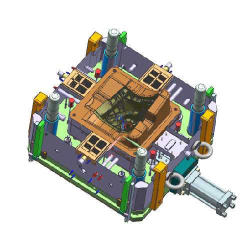 半固態成型薄壁大產品,三板模結構模具,特殊的流道倒扣結構保證了開模中使用機械力與流道自動拉斷,且使用特殊的扣機機構確保模具在開模拉斷流道的過程中,后模與前模板不分開,另所生產的產品無需T6熱處理可達到材料性能要求。